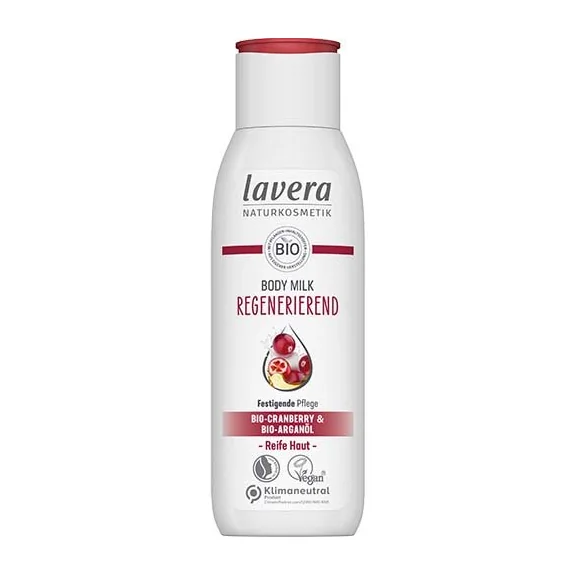 Lavera Regenerating Body Lotion – Regenererende body lotion med økologisk tranebær og dyrebare olier såsom økologisk argan olie. Fremmer hudens regenerering og er særligt velegnet til moden hud med behov for opstramning.
