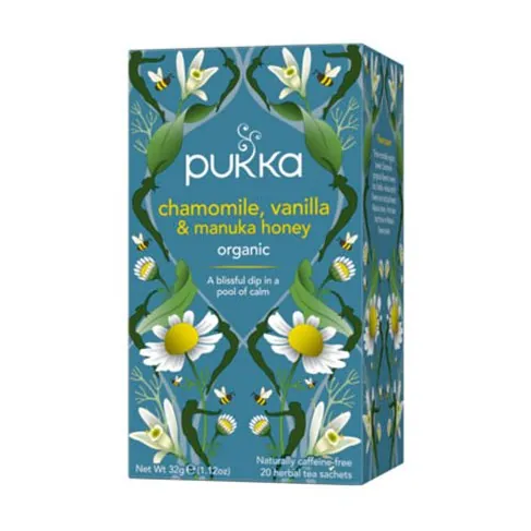 Pukka Chamomile, Vanilla & Manuka tea er en skøn kop økologisk kamille te, som har et let strejf af vanilje og manuka honning. Det er en te, som inviterer til fornyet indre ro. De fineste kamilleblomster udvælges til at lave denne skønne afrundende te. Nyd en stille stund. Naturligt fri for koffein.