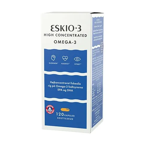 Eskio-3 High Concentrated kaspler er fiskeolie rig på omega-3 fedtsyrerne EPA og DHA. Eskio-3 High Concentrated er en koncentreret fiskeolie, hvoraf total omega-3 fedtsyre i naturlige triglycider udgør mindst 65%. DHA bidrager til at vedligeholde en normal hjernefunktion og et normalt syn. Den gavnlige effekt opnås ved at dagligt indtag på 250 mg DHA. EPA og DHA bidrager til en normal hjertefunktion. Den gavnlige effekt opnås ved at dagligt indtag på 250 mg EPA og DHA.