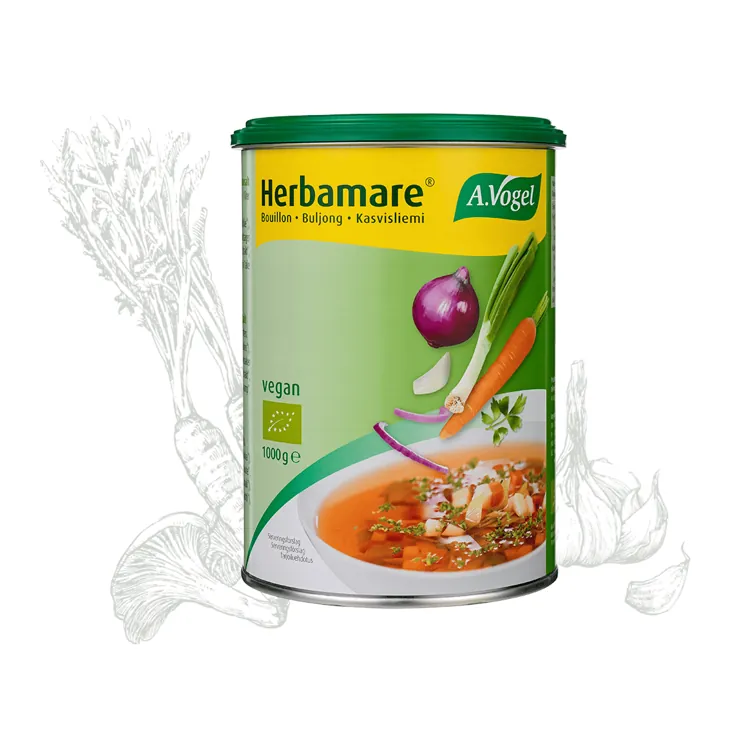 Herbamare Bouillon er en urtebouillon, der kan hjælpe dig med den gode smag i køkkenet. Med Herbamare kan du skrue op for smagen i alt fra varmende vintersupper, simreretter og grundsaucer til vegetarkøkkenet eller de kødfrie dage. Herbamare Bouillon er nemlig fyldt med kraften fra økologisk dyrkede grøntsager og krydderier, hvilket gør den ideel til supper, saucer, sammenkogte retter og i kogevandet til for eksempel ris.
