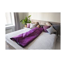 8) Så snart tæppet føles varmt, åbner du tæppet og breder det ud. Derefter lægger du et håndklæde over stenene. Du bruger et andet håndklæde over dig selv. En anden mulighed er at lægge dig ind i et dynebetræk, så tæppet er helt beskyttet. Tag tæppet over dig og luk lynlåsen fra fødderne og helt op til nakken. Vær opmærksom på at dække skuldrene for at forhindre varmetab.