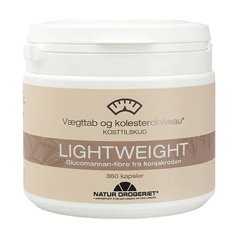 Natur-Drogeriets Lightweight er kapsler med en blanding af glucomannan-fibre fra konjakroden, inulin fra cikorierod og hybenpulver. I forbindelse med en kaloriereduceret kost bidrager glucomannan til vægttab, og når det kommer til et normalt kolesterolniveau i blodet, medvirker glucomannan til at vedligeholde dette. For at bidrage til vægttab skal du indtage 3 kapsler 3 gange (3 g) dagligt før et måltid, og for at vedligeholde et normalt kolesterolniveau skal du indtage 4 kapsler 3 gange dagligt (4 g).