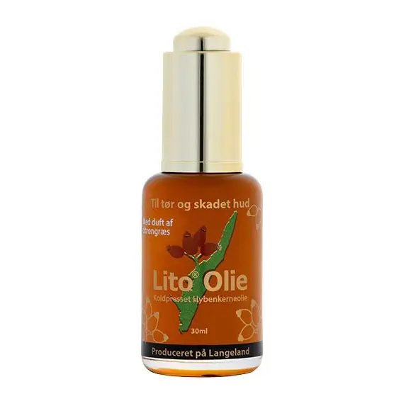 Lito® Olie til tør og skadet hud, er en nærende og reparerende kvalitets-olie. Produceret på Langeland af Hyben Vital ApS ud fra skånsomt tørrede hybenkerner, efter en patenteret tørrings-/ fremstillingsmetode. Lito® Olie er 100% koldpresset hybenkerneolie, og er rig på Omega fedtsyrer og naturlige antioxidanter. Den indeholder ingen tilsætningsstoffer.