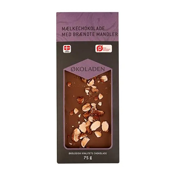 Økologisk mælkechokolade med noter af karamel drysset med et godt lag knuste brændte mandler.