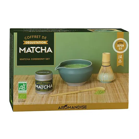 Komplet gaveæske med Aromandise Ceremonial grade Matcha fra Uji, Japan og alt nødvendigt udstyr til at lære kunsten bag den perfekte matcha.