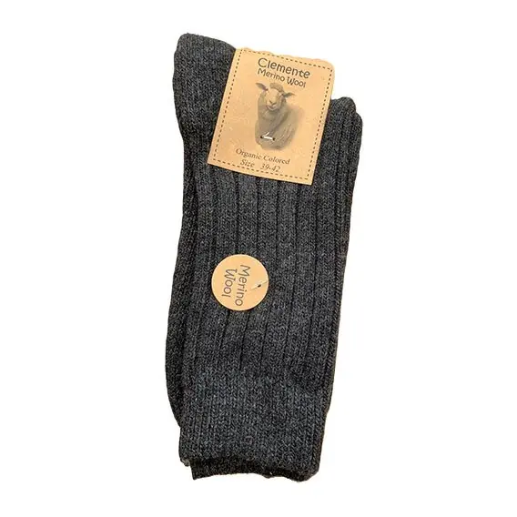 Merinostrømper – Koksgrå – str. 43/46. Der er strikket frotté ind i sålen, som gør den blød at gå på, og svedabsorberende. Kan bruges både til støvler, sko, og som hyggestrømper.