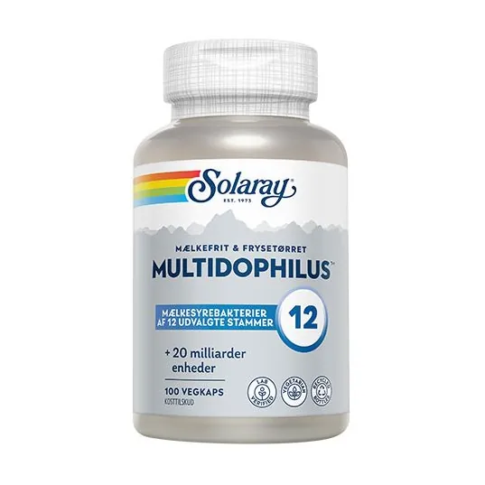 Multidophilus 12 indeholder 12 udvalgte stammer af levedygtige mælkesyrebakterier.