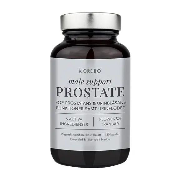 NORDBO Male Support Prostate er formuleret til at forbedre prostata-, urinvejs- og blæresundhed hos mænd. Med 6 aktive ingredienser: Flowens (tranebær), græskarkerner, granatæble, brændenælde, zink og selen.