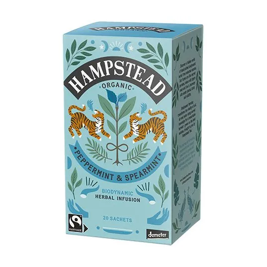 Nyd en forfriskende og kølende urtete fra Hampstead, i Demeter certificeret kvalitet. Spearmint fremhæver pebermynten på fineste vis. Tebrevene er plastikfri og komposterbare. 1 pakke indeholder 20 tebreve.