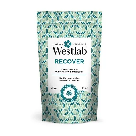 Westlab Recover mineralsk badesalt beriget med eucalyptus æterisk olie, hvidpil og arnica for at genoplive kroppen.