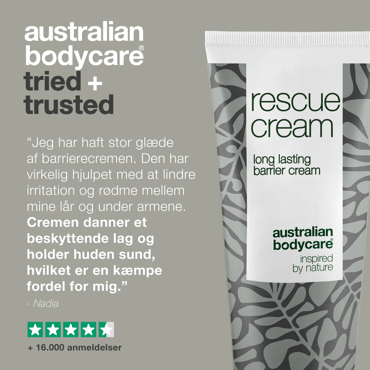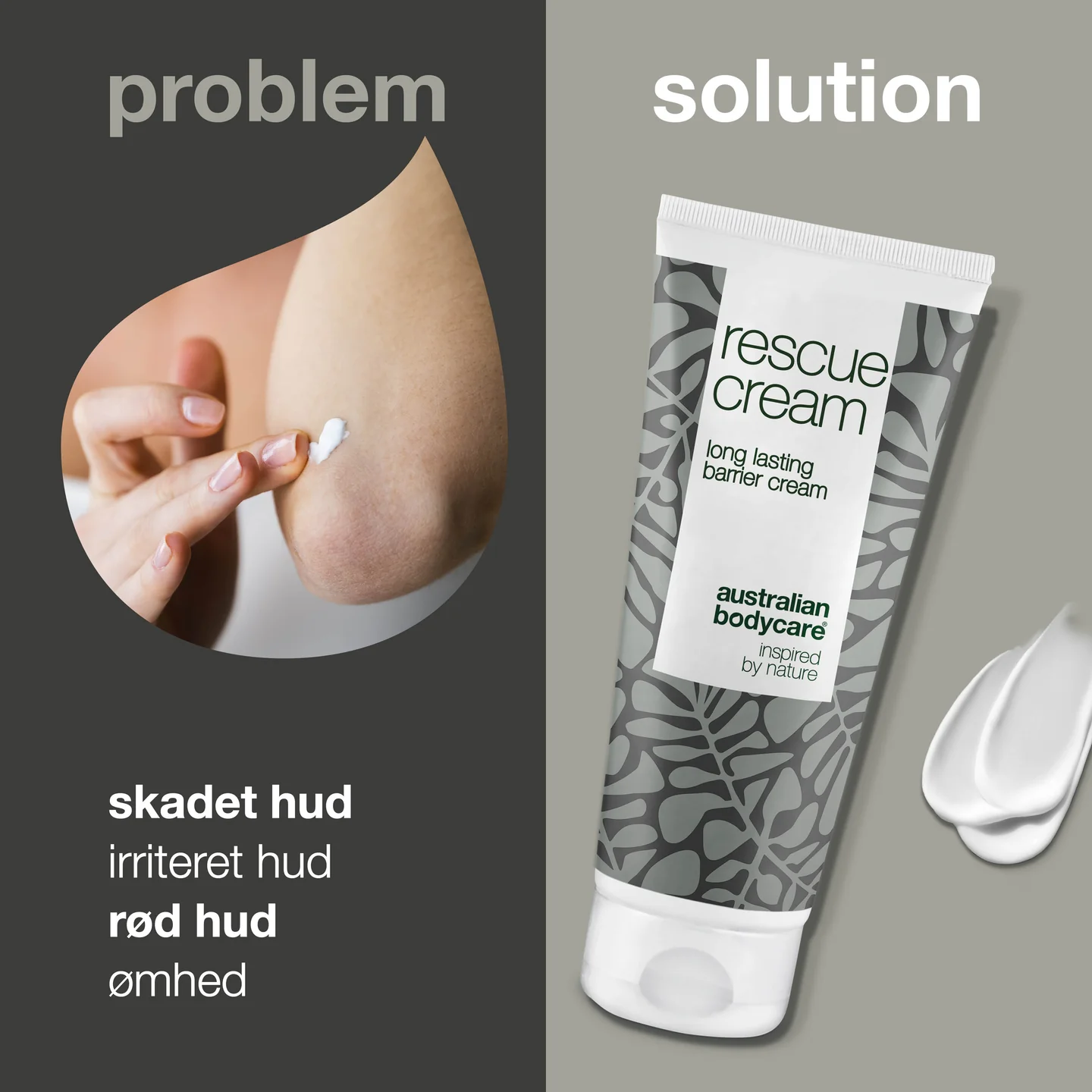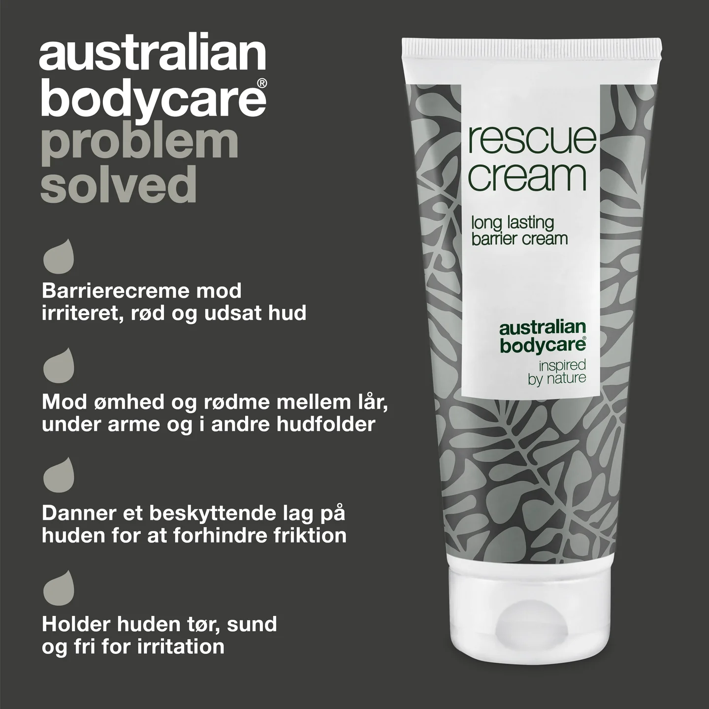Så smør et beskyttende lag Rescue Cream fra Australian Bodycare på huden, så du undgår rødme, irritation og ømhed mellem lår, under arme og ved andre hudfolder på kroppen.
