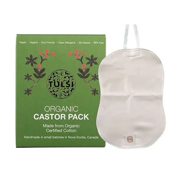 Sådan gør du: Læg omslaget fladt, med bomulds siden opad. Hæld 1-3 spsk TULSI Økologisk Castor/Ricinusolie på midten af omslaget og fordel det forsigtigt. Lad omslaget ligge et øjeblik og suge olien til sig. Placer omslaget med olien på det ønskede område med den olierede side mod huden. Bind stropperne rundt om kroppen så omslaget sidder behageligt.