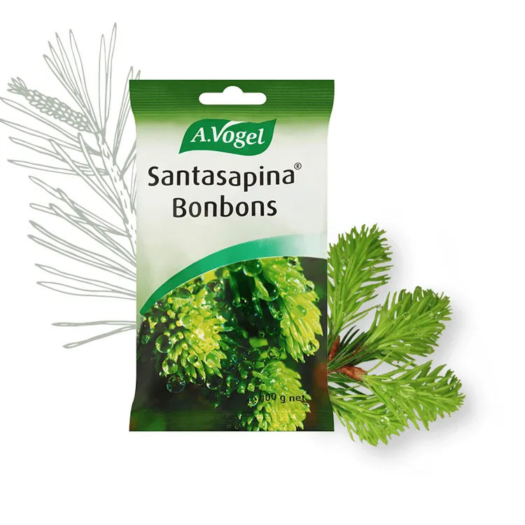 Trænger du til at opfriske din ånde i løbet af dagen? Eller har du af og til brug for at få klaret halsen? Eller har du blot brug for lidt sødt at suge på i løbet af dagen, men vil stadig gerne vælge noget naturligt og undgå unødige tilsætningsstoffer? Så skal du prøve A. Vogels Santasapina Bonbons. Santasapina Bonbons smager på en og samme tid sødt og friskt: den søde smag skyldes den bløde kerne med honning, og den friske smag kommer fra ekstrakt af friske granskud samt mentol. Bolsjerne kan dermed fungere som en glimrende forfriskning i løbet af dagen, hvor de tilmed klarer både hals og stemme. Bolsjerne kan nydes af både voksne og børn.