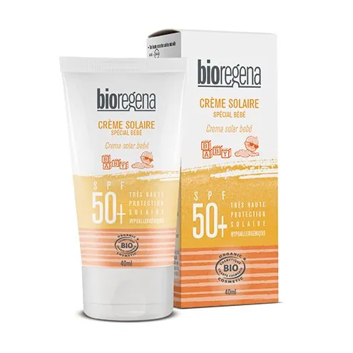 Giv din baby den sikreste start i solen med Bioregena Sunscreen Cream Baby SPF 50+. Køb nu og nyd fredelige stunder udendørs med tryghed og ro i sindet.Økologiske, prisvindende solprodukter! Giver høj beskyttelse mod UVA1, UVA2 og UVB uden at efterlade en hvid hinde på huden. Indeholder kun mineralfiltre og plejende økologiske ingredienser, fx arganolie, som har en anti-aging effekt på huden. Også velegnet til meget følsom hud. 100% naturlig, skader ikke organismer, der lever i vand og indeholder ingen nanopartikler. Økologisk certificeret i henhold til Cosmetic Bio – Organic Cosmetic.