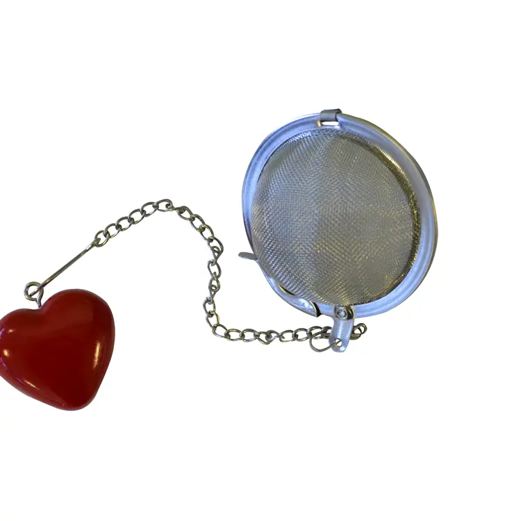 Sødt te æg med et lille rødt hjerte hængende i kæde. Ø 5 cm – til en kop eller et glas.
