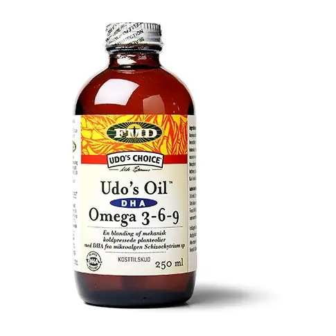 Udo’s Oil DHA 3, 6 Blend anvender DHA-rig olie udvundet af mikroalgen Schizochytrium sp.