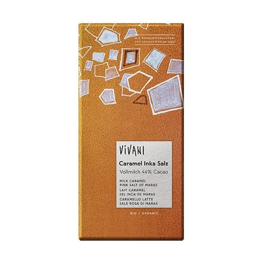 Vivani karamel Inka Salt er økologisk mælkechokolade, mindst 44 % kakao, med sprød karamel og rosa Inka salt. Sødet med kokosblomst-sukker.