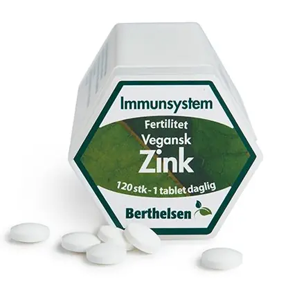 Berthelsens Zink er vegetabilsk kosttilskud med organisk bundet zinkgluconat. Zink bidrager bl.a. til • normal funktion af immunsystemet • normal testoster…